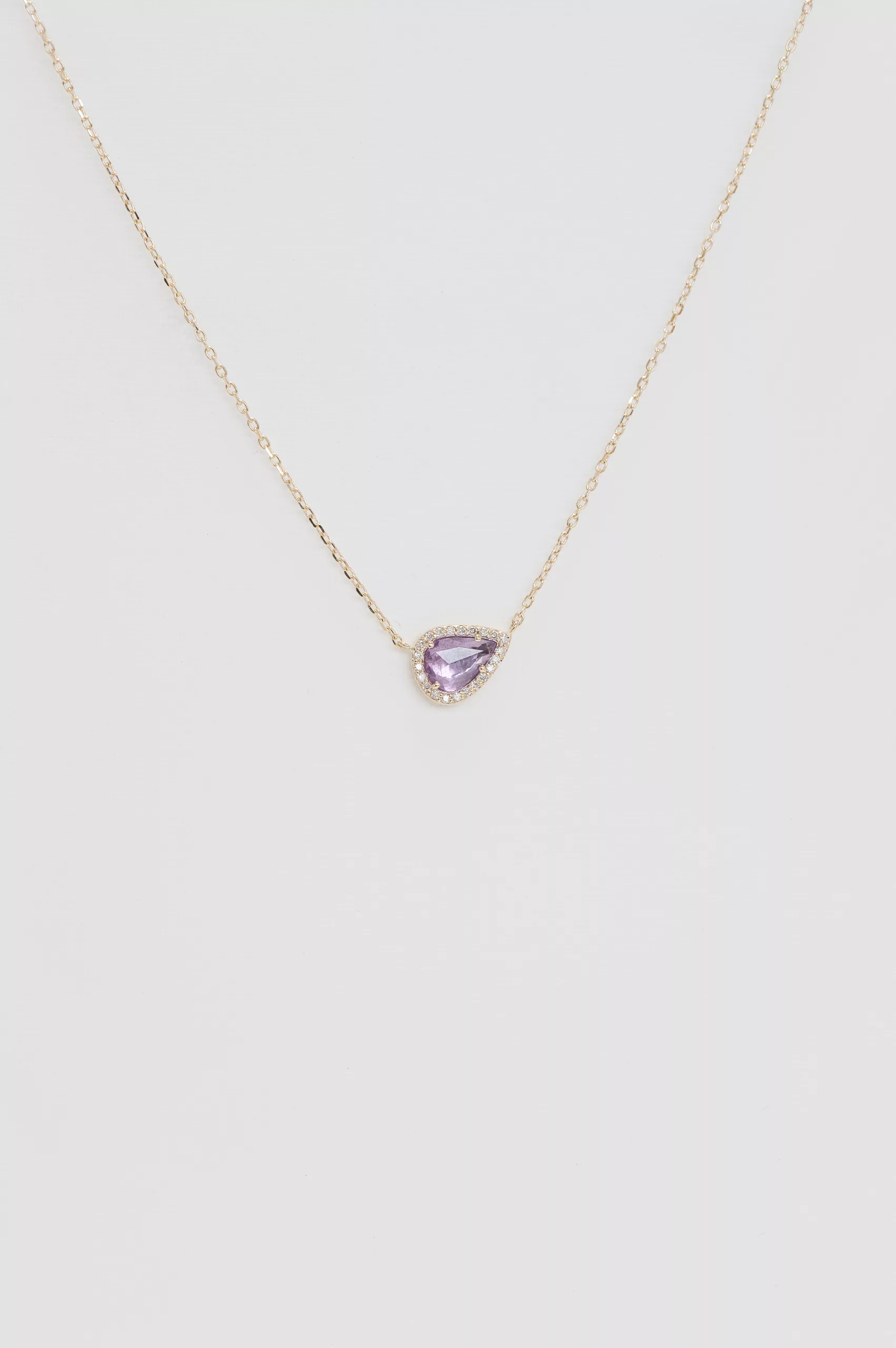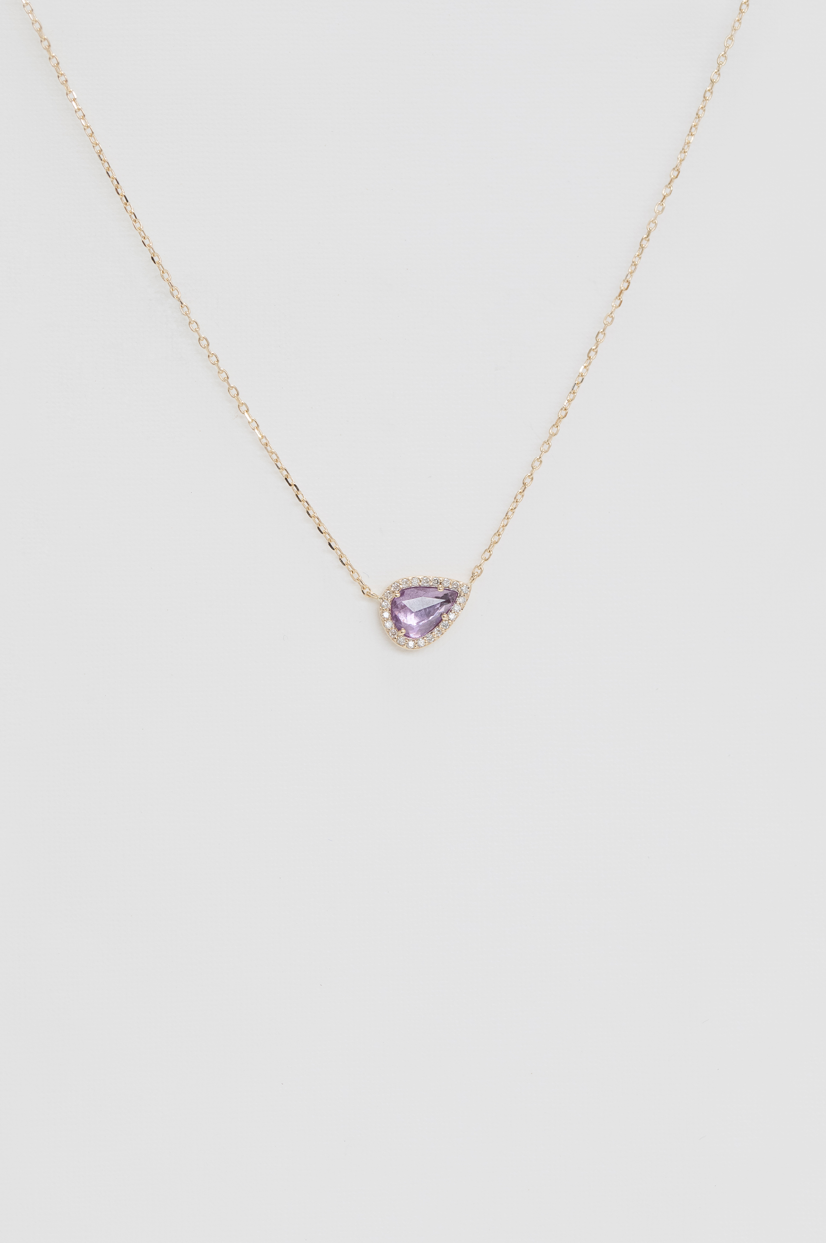 CELINE DAOUST 14K LIGHT YELLOW GOLD CHAIN NECKLACE WITH ONE SAPPHIRE SURROUNDED BY DIAMONDS. THE STONE COMES IN A GRADIENT OF PINK.