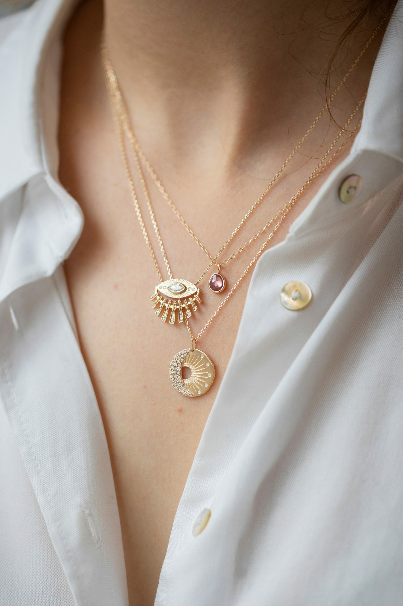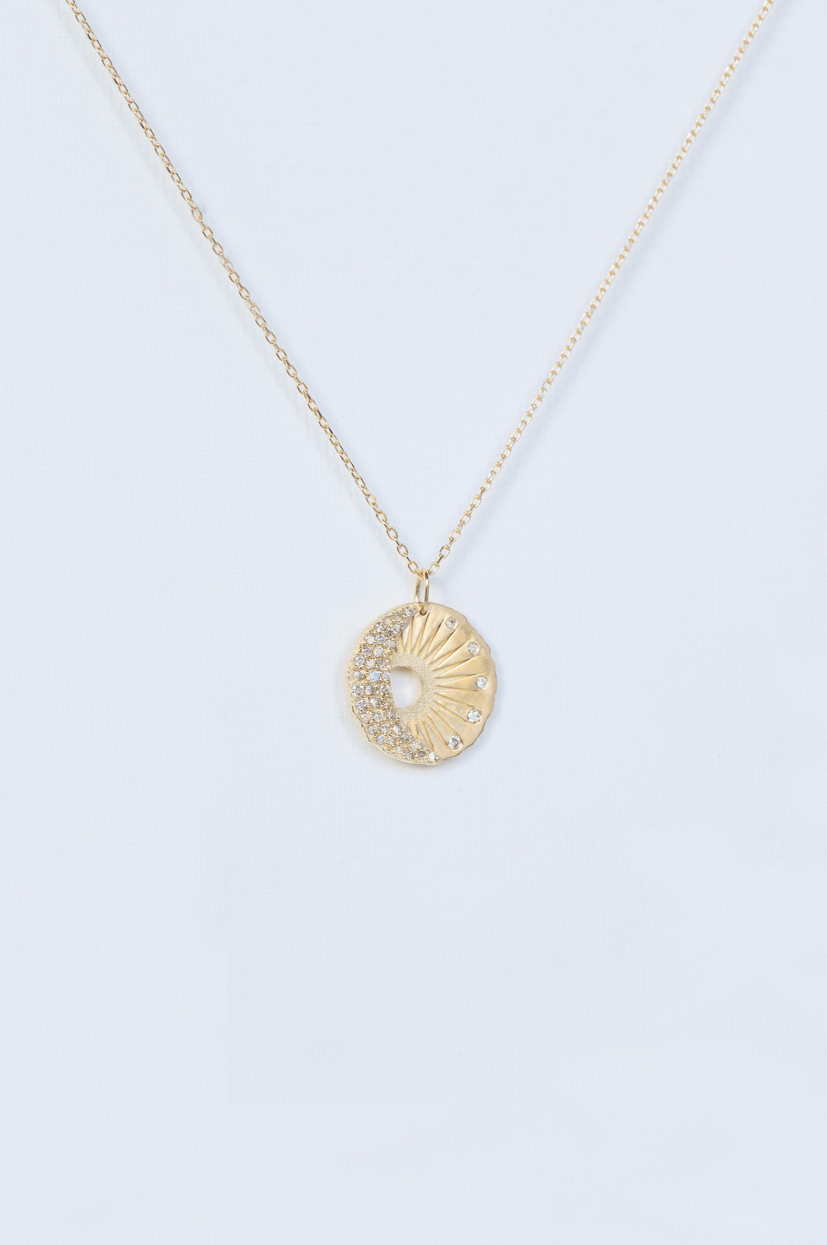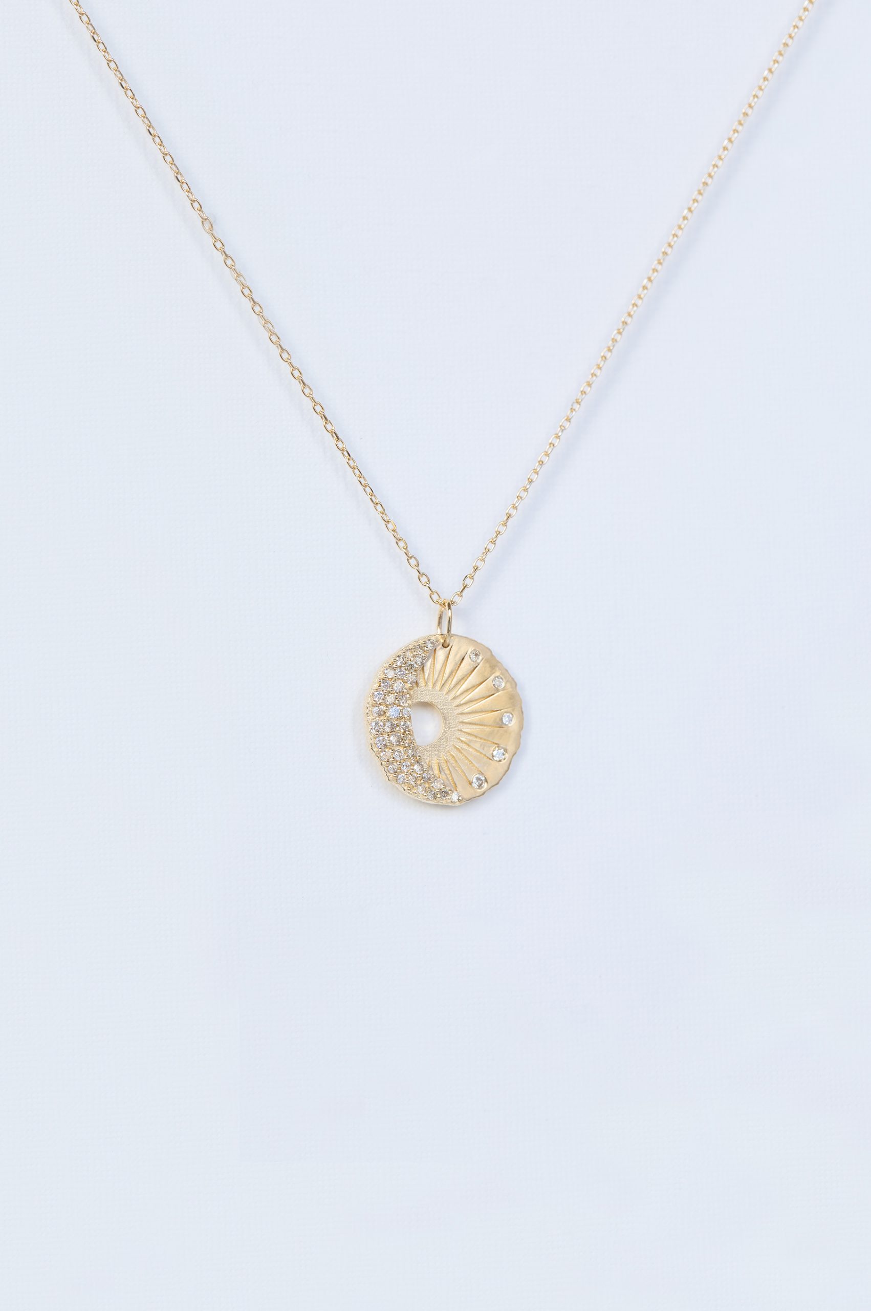 CELINE DAOUST 14K Light Yellow Gold Sun and Moon Diamond Medal Pendant Necklace.